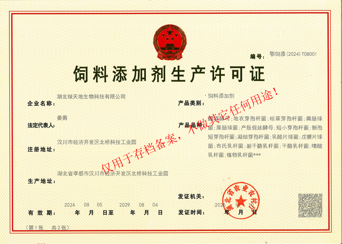 湖北綠天地生物科技有限公司 (簡稱綠天地公司)投資7000萬元,擁有25000平方米的廠房和國內先進的設備360臺套,建有微生物發酵、發酵冷凍干燥、低溫造粒等8個車間,發酵罐總容量450立方米,專業的飼用級益生菌發酵生產基地。 公司已通過IS09001:2015質量管理體系認證。 綠天地公司得到了華中農業大學、中國農...